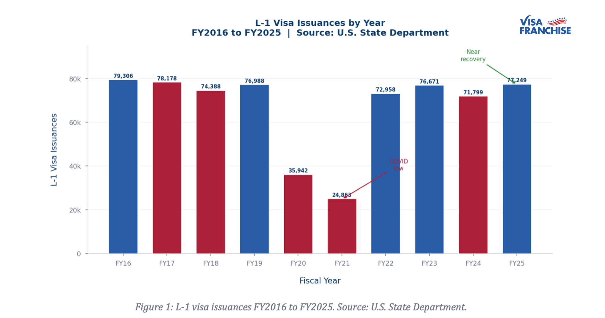 The State Department publish edits FY2025 nonimmigrant visa statistics in full. For the L-1 intracompany transfer visa, the headline number is 77,249 total issuances, up 7.6% from FY2024 and nearly back to the pre-pandemic level of 79,306 set in FY2016.